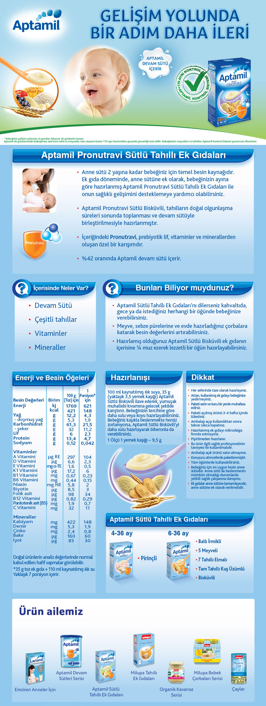 • Aptamil Kaşık Sütlü Ek gıdaları, içeriğindeki tahıllar, prebiyotik bileşenler, A, B1, B6, Biotin, D3, C, E vitaminleri, kalsiyum, demir ve iyot mineralleri ile bebeğinizin gelişimini desteklemeye yardımcı olur.