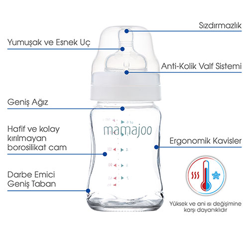 • mamajoo Cam Biberonlarda anti-kolik valf sistemli biberon emziği bulunur ve doldurmayı veya temizlemeyi kolaylaştırmak için geniş ağızlı olarak tasarlanmıştır.